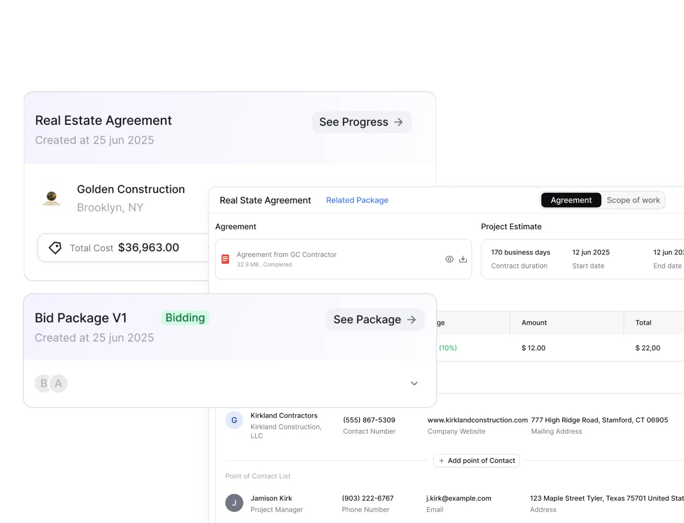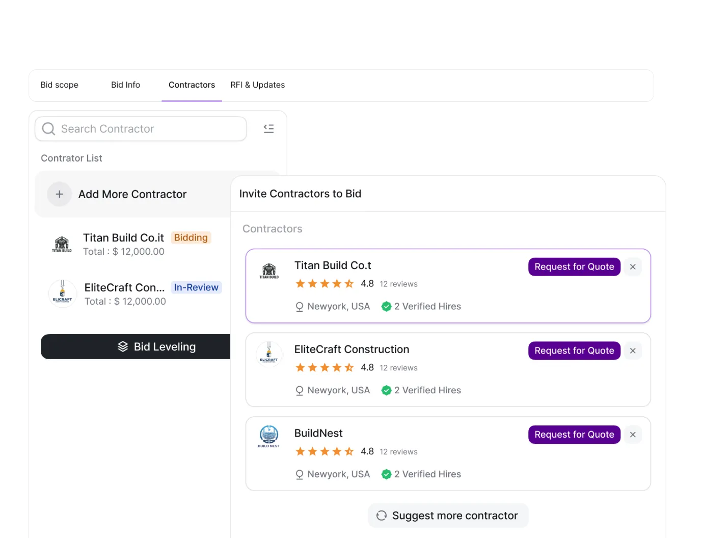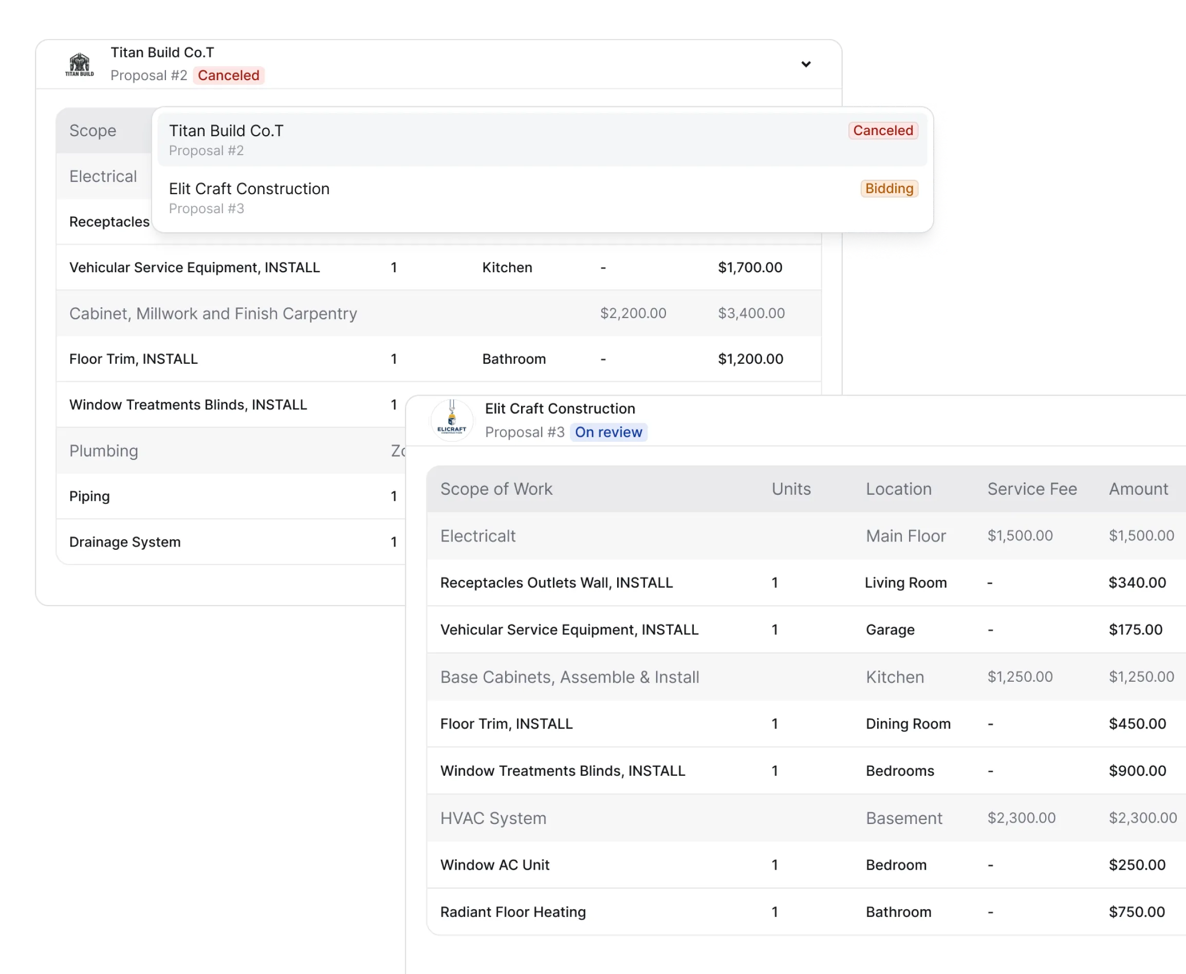 Receive quotes from our vetted general contractors or your own. Compare bids side by side in a single structure format and communicate with them efficiently, all in one place.